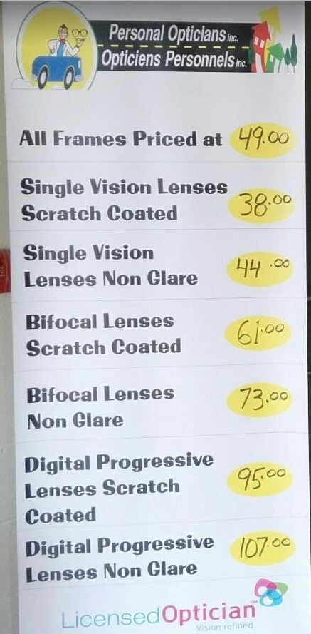 If you don’t have vision insurance our lens and frame prices are on the banner below and also posted in the Peter McKee Community Centre entance.